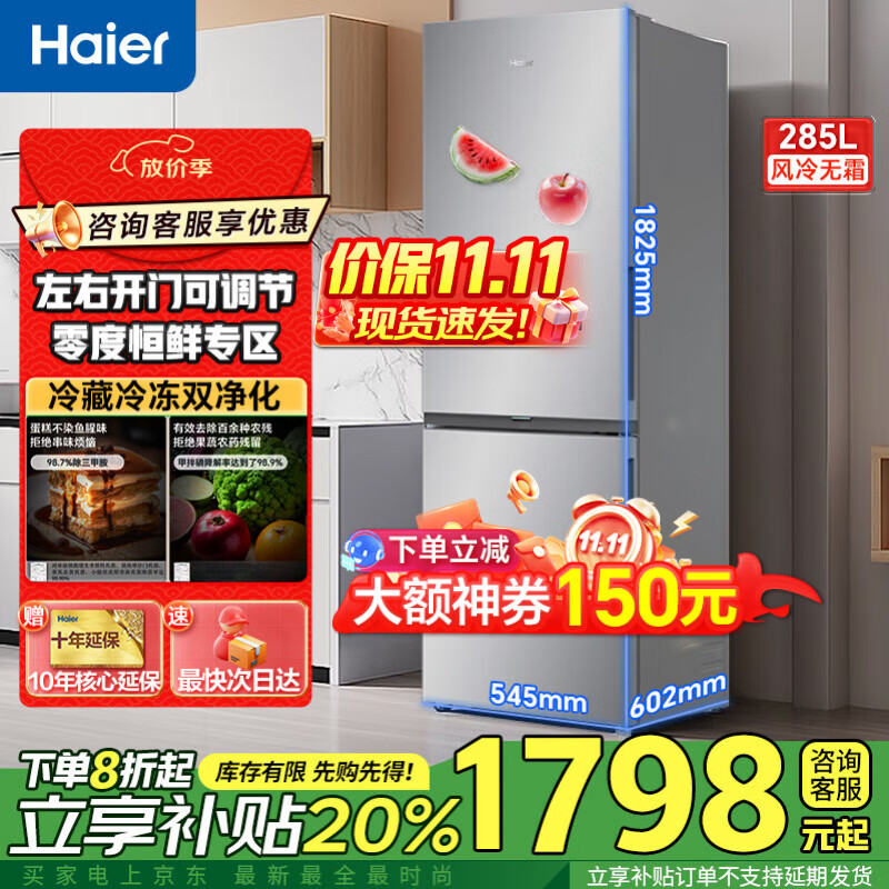 包邮 海尔冰箱285升283升两门三门双开门风冷无霜一级能效家用电器以旧换新电冰箱零度恒鲜左右换开门 285升双门风冷无霜左右开门