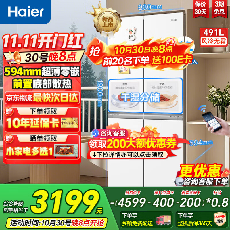 包邮 海尔【国家补贴20%】海尔冰箱491L大容量家用电器零嵌法式十字电冰箱风冷无霜超薄594cmm零嵌一级能效 491升超薄零嵌入式冰箱